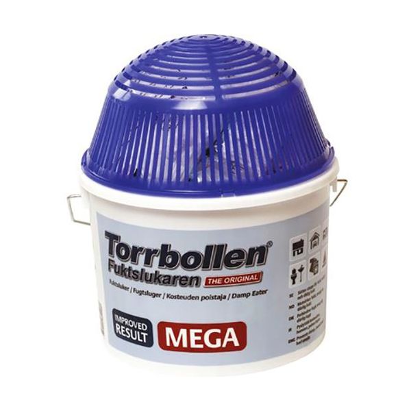 Större variant av fuktslukaren Torrbollen som suger upp överskottsfukt i omgivande luft, vilket minskar risken för mögel och dålig lukt. Levereras med tre refillpåsar, vilka räcker i 1-3 månader beroende på hur fuktig luften där den står är. Torrbollen® – Mega passar ytor som är ca 35 m² stora.